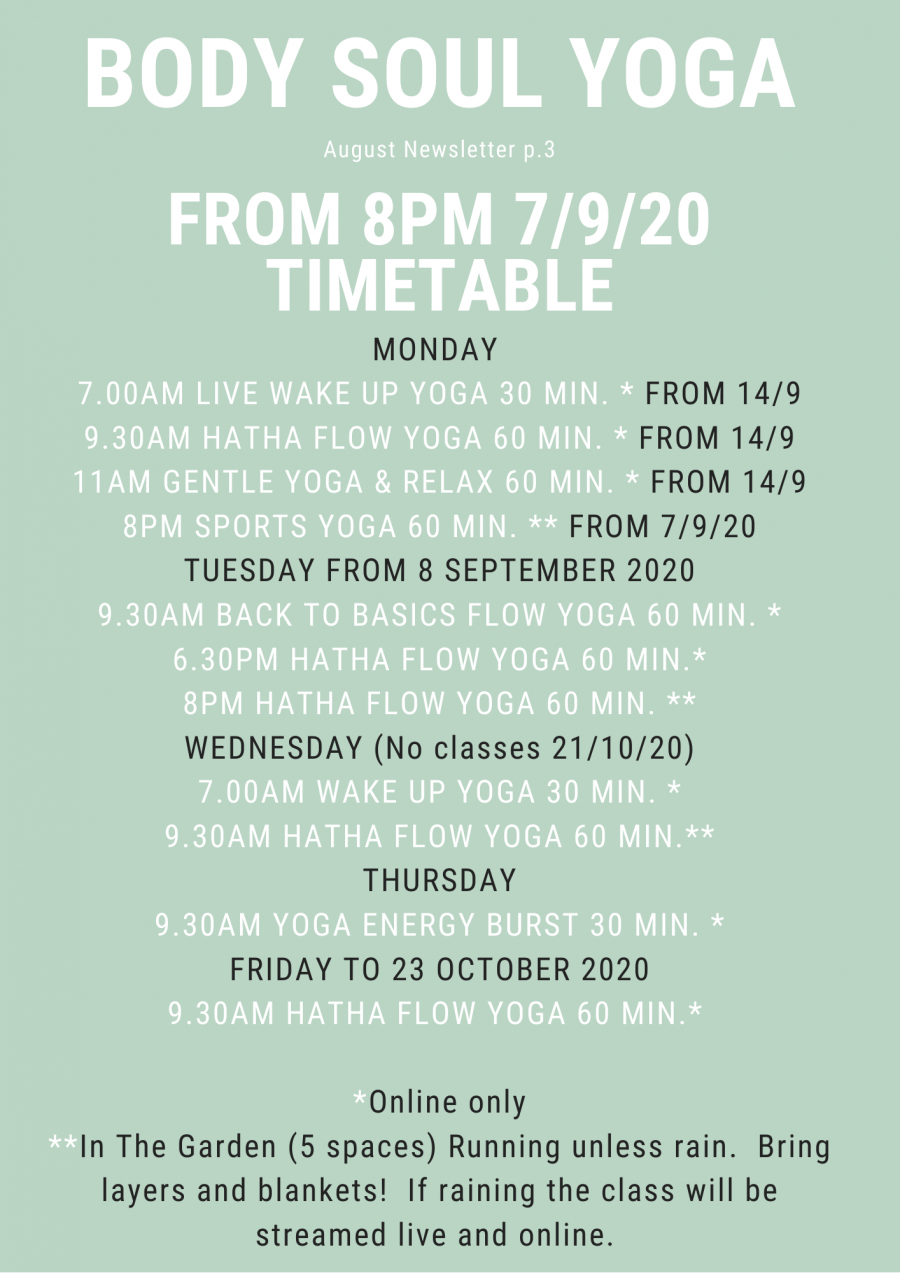Please take a look at the below newsletter and the following links, which will give you more information. [It details the classes on offer, please look out for our new: Yoga In the Garden Courses, and our earlier 7am Wake Up Yoga groups on Mondays and Wednesdays, our new Autumn 2020 Timetable and our online offering, and our private back catalogue of live classes, free to all members.]