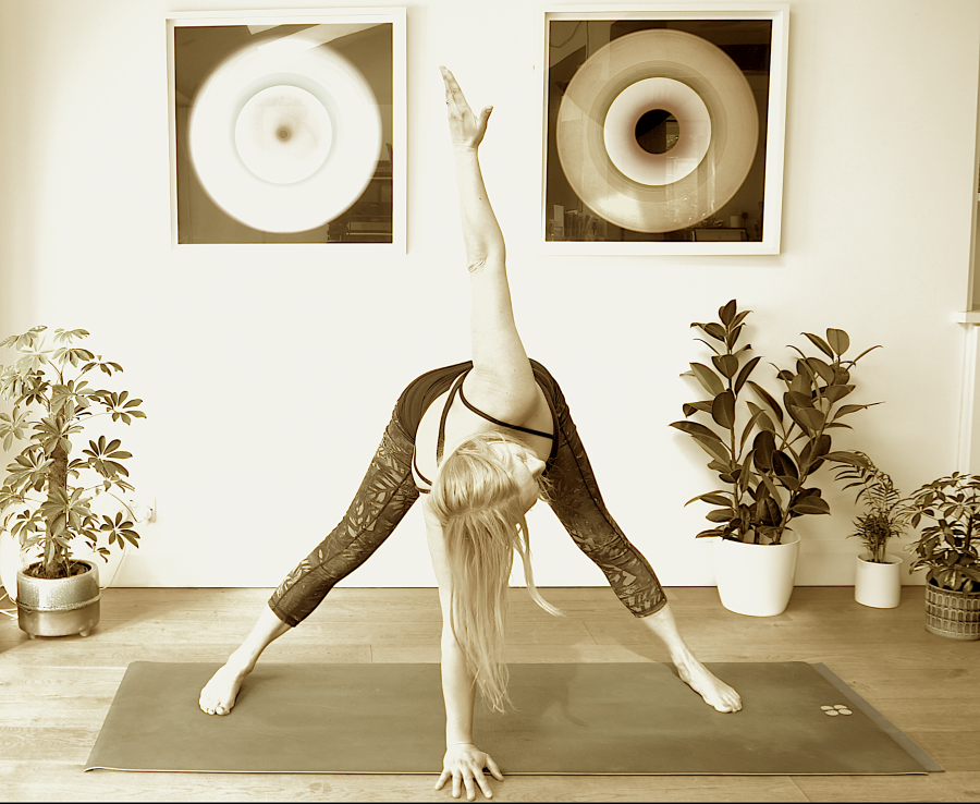 We flow through Surya Namasakar, Surya Namasakara A and B, a Warrior flow, wide legged forward folds and rotations and plank crunches and yogic cycles.