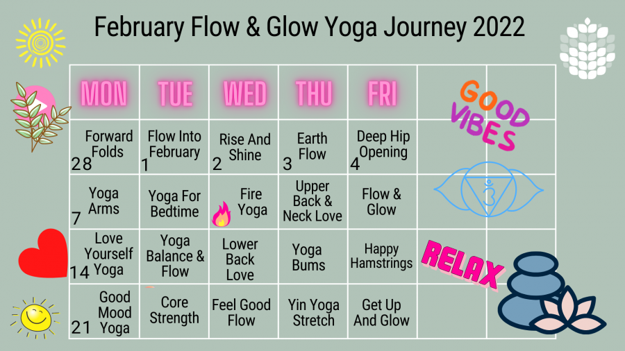 We are delighted to let you know that our On Demand Yoga Video Journey will continue in February 2022 with Flow & Glow Yoga. Join us every weekday for just 20-30 minutes of yoga to improve your fitness, strength, flexibility, mobility and mood! Get ready to flow through yoga sequences to make you glow with health and vitality! Below are the yoga class themes for February 2022. The classes are suitable for all and include variations if you want to go deeper or ease things off. The weekday classes are FRESH & NEW:
