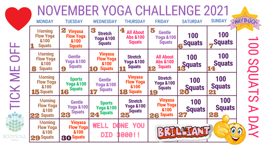 The November Yoga Challenge starts on Monday 1 November 2021 through to and including 30 November 2021.