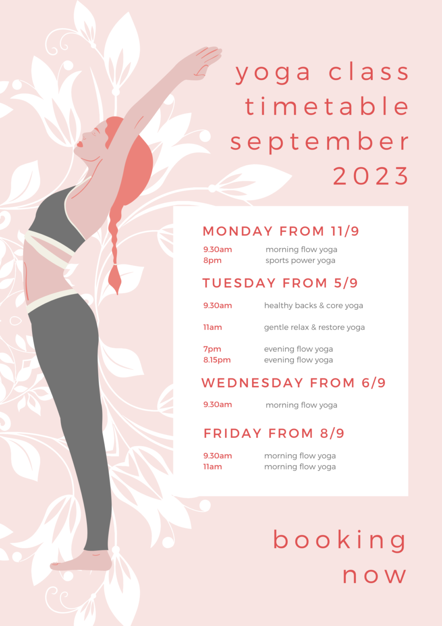 Hello.  I hope you are having a great summer?  Our group yoga classes return from Tuesday 5 September 2023 and we hope that you can join us?  Please note that there will be no classes on Friday 22 and Monday 25 September 2023.  We have added new classes too, and the details are below: